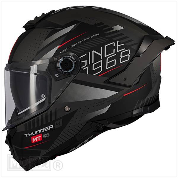 Het nieuweTHUNDER 4 (HIRP) model nu met perfecte pasvorm en geïntegreerd zonnevizier, is verkrijgbaar in verschillende (effen) kleuren en designs. De helm wordt standaard geleverd met een Pinlock & Fog-off voorbereidt vizier en heeft een gebruiksvriendelijke micrometic kinsluiting.